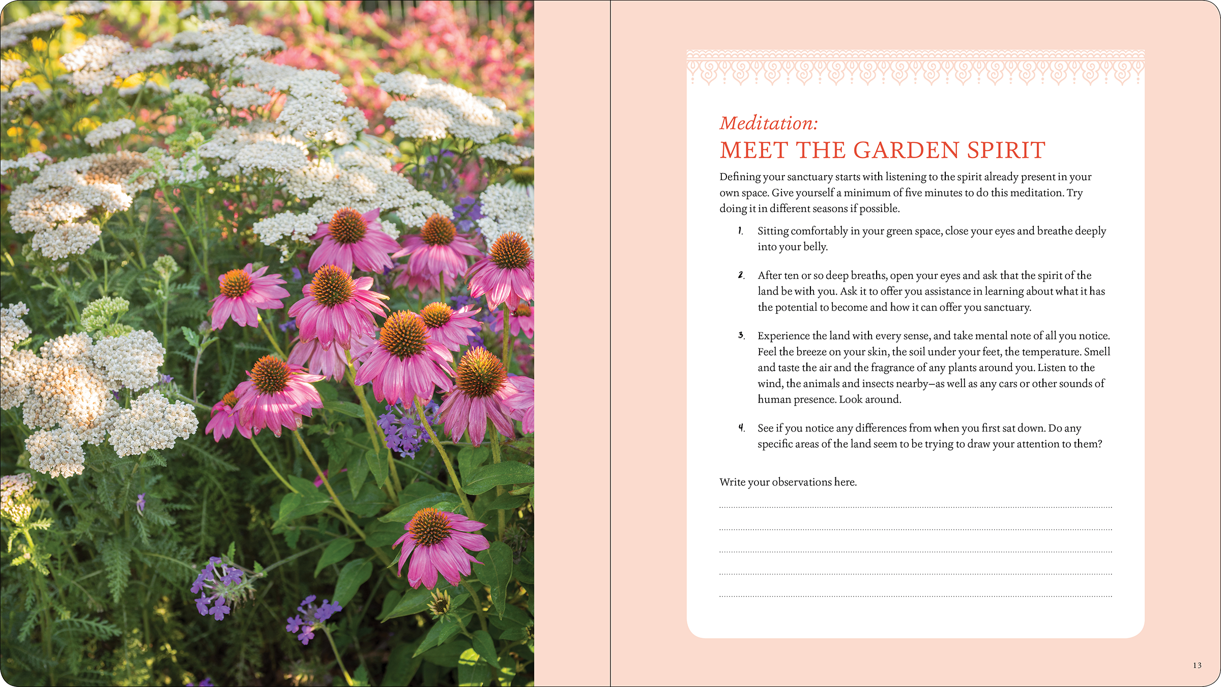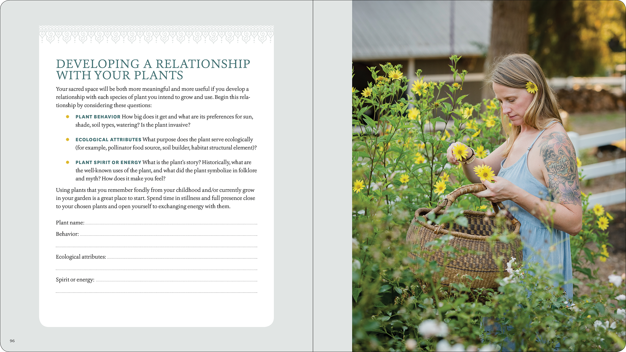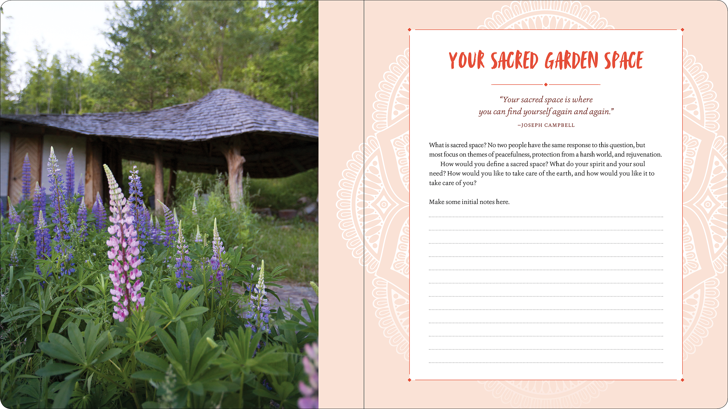 Layout design for a workbook filled with writing prompts and exercises to help readers create gardens that will nourish their spiritual and emotional well-being.