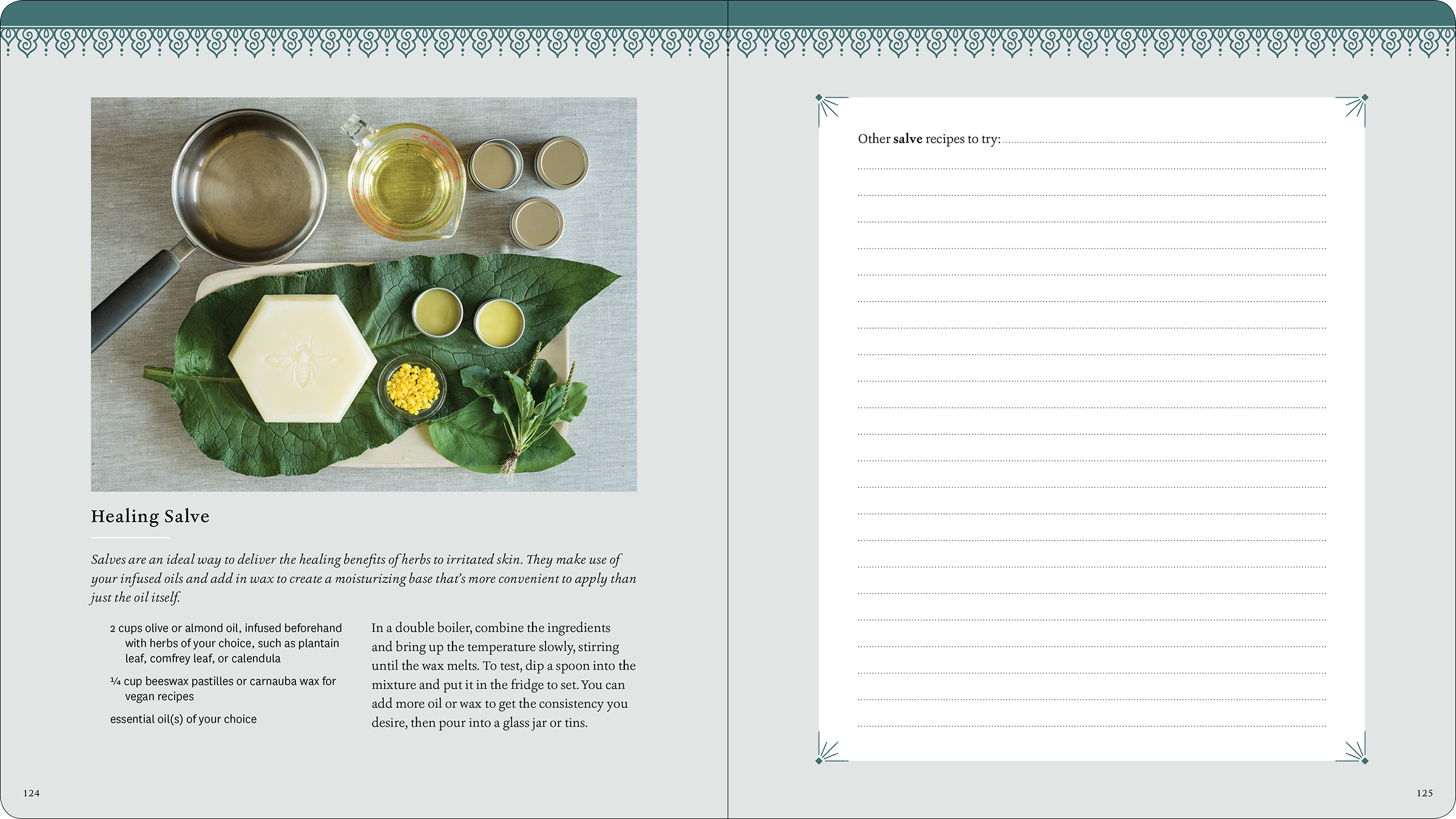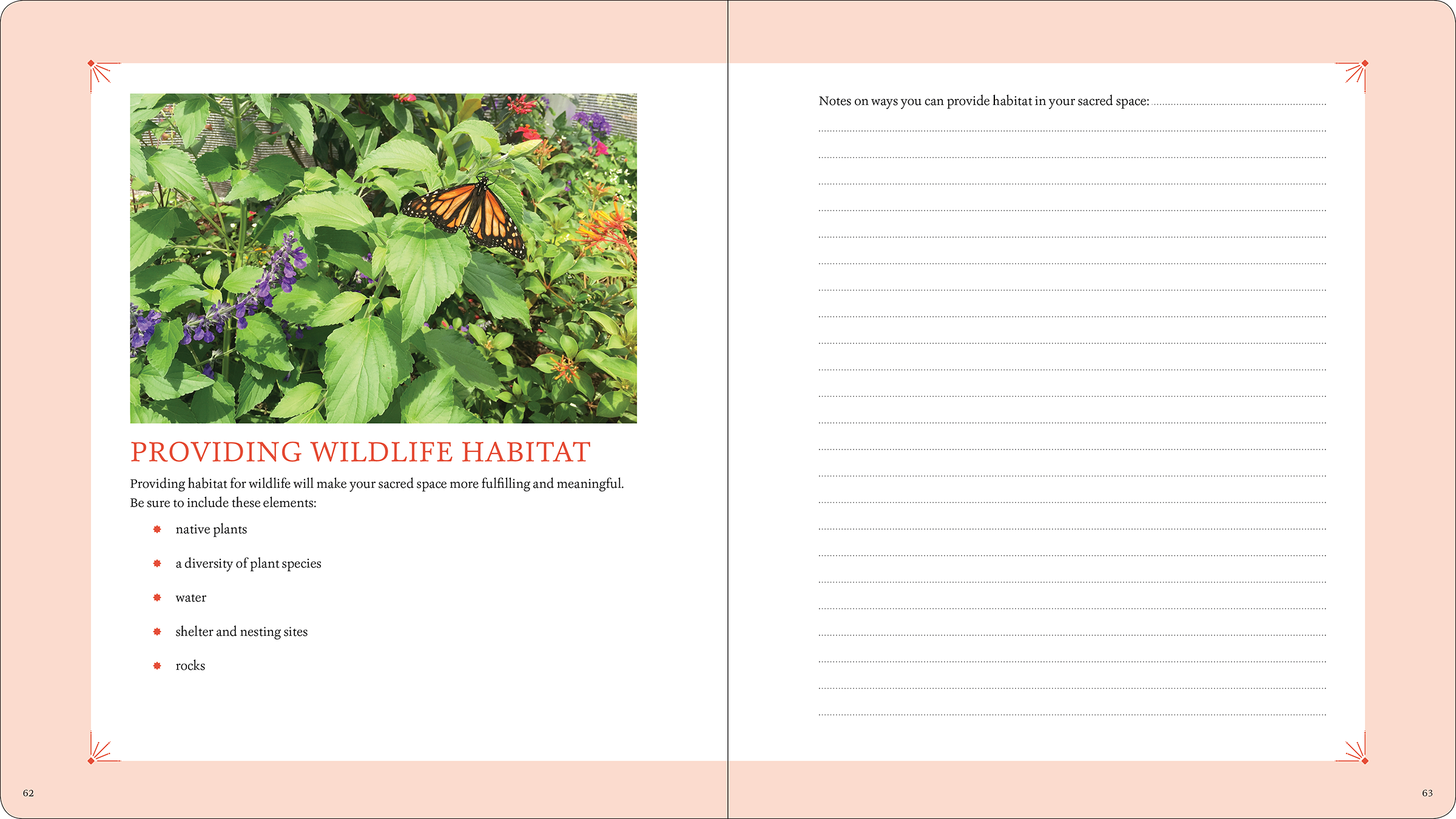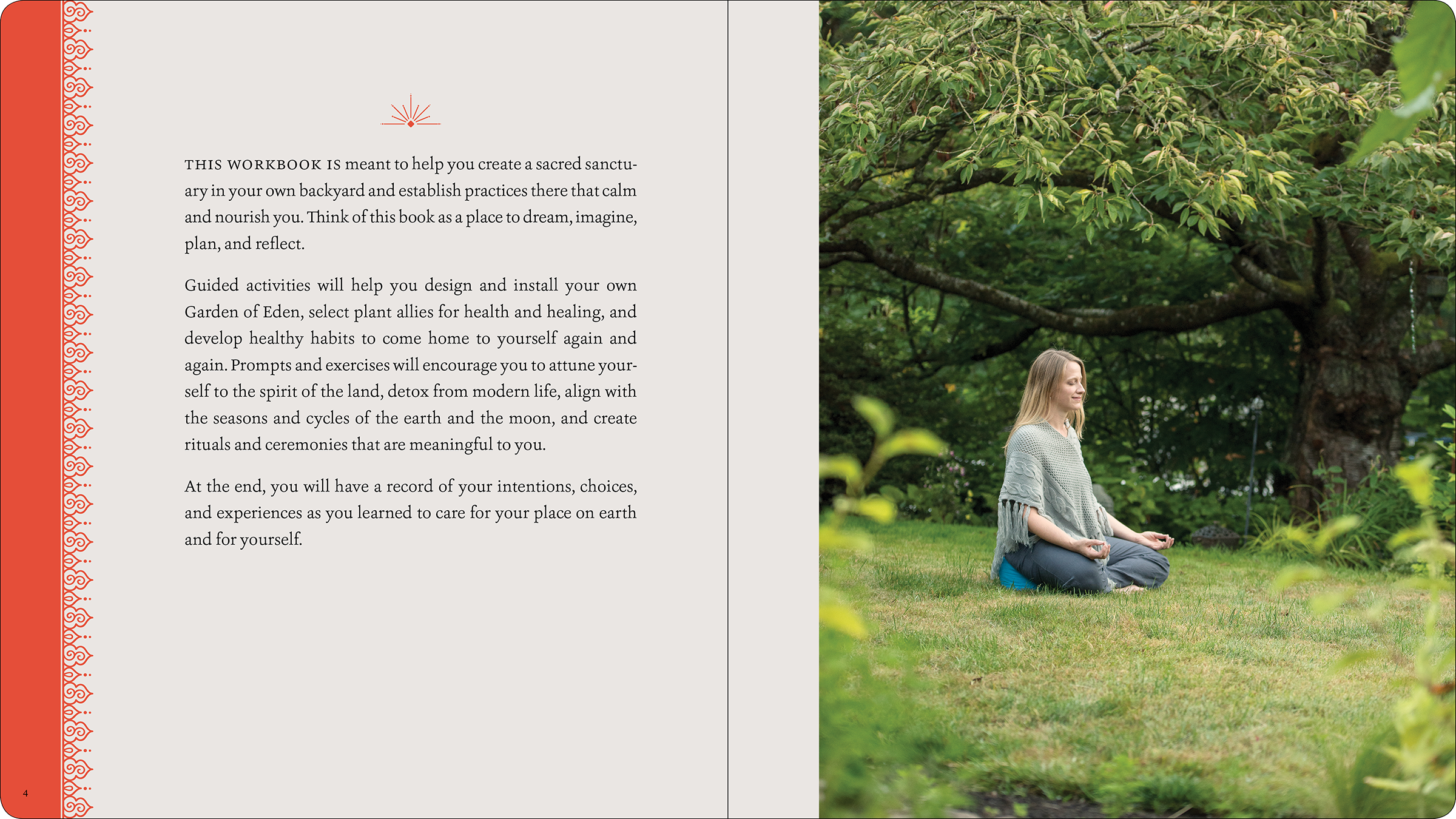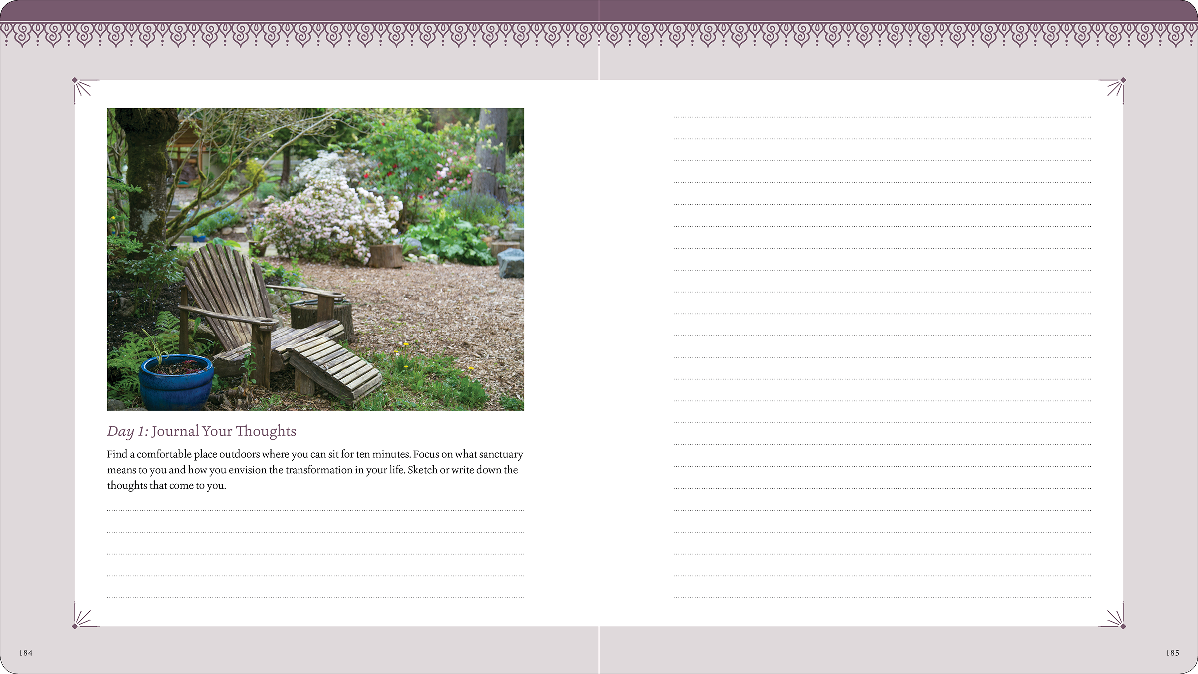 Layout design for a workbook filled with writing prompts and exercises to help readers create gardens that will nourish their spiritual and emotional well-being.